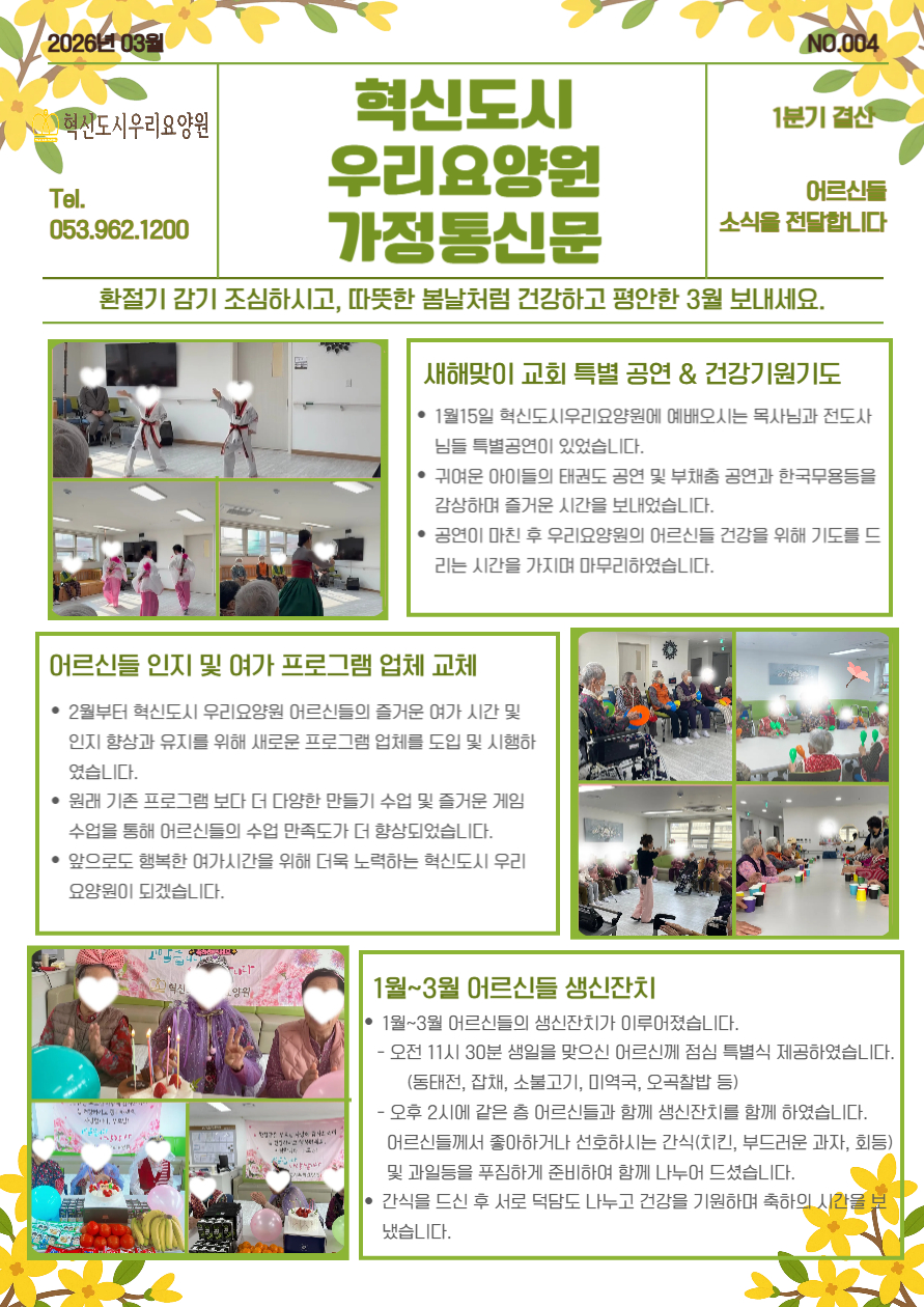 26년 1분기에는 어르신들 새 프로그램 업체 도입 및 새해 맞이 특별 공연 등이 진행되었습니다^^